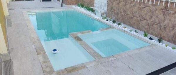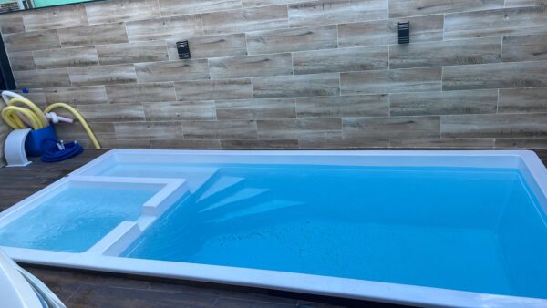 Piscina de fibra com tripla camada de proteção. Design mais amplo e sofisticado com opção de dar aquele toque especial, é só você escolher a pastilha que mais lhe agrada e personalizar sua piscina. Piscina acompanha: filtro e bomba Cascata cisne 2 pontos de Hidromassagem 1 led azul 1 kit aspiração